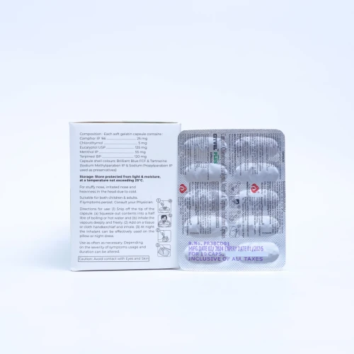 | COMPOSITION: | Camphor(25mg),chlorothymol(5mg),eucalyptol(125mg),terpineol(120mg) & Menthol(55mg) Soft Geletin Capsules |