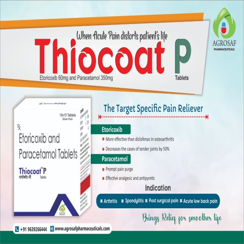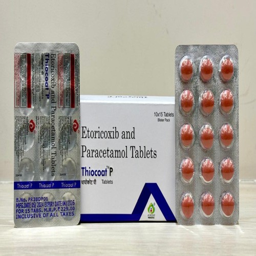 | Description: | THIOCOAT P Tablet is a combination analgesic and anti-inflammatory medicine containing: Etoricoxib 60mg – a selective COX-2 inhibitor that reduces pain and inflammation. Paracetamol 325mg – an analgesic and antipyretic that helps relieve mild to moderate pain and reduce fever. This combination is used for pain relief and inflammation management in conditions such as osteoarthritis, rheumatoid arthritis, musculoskeletal pain, and post-operative pain. By combining Etoricoxib and Paracetamol, THIOCOAT P provides enhanced pain control with faster relief and improved patient outcomes. |