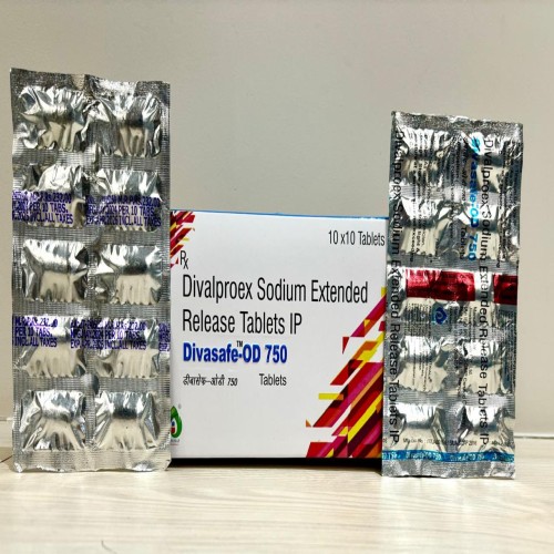 | Description: | DIVASAFE OD 750 Tablet contains Divalproex 750mg in an extended-release (OD – once daily) formulation. It is an anticonvulsant and mood stabilizer used for the treatment of epilepsy, bipolar disorder, and prevention of migraine headaches. The extended-release formulation ensures gradual drug release, maintaining stable plasma levels for sustained therapeutic effect and improved patient adherence. |