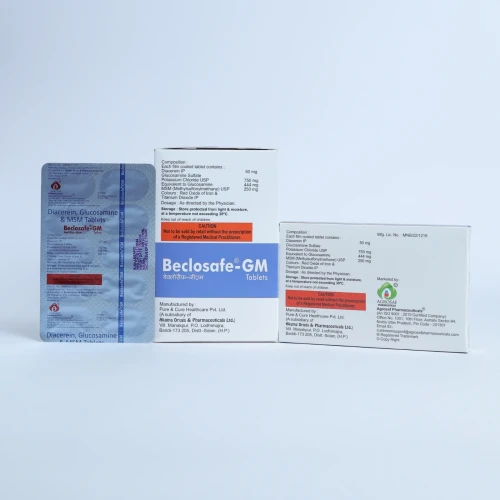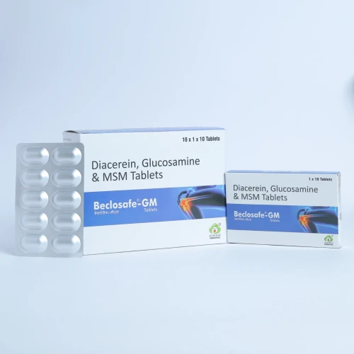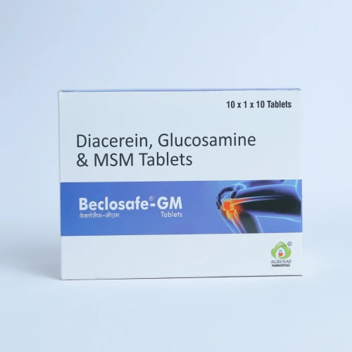 | Description: | BECLOSAFE-GM Tablet is a joint health and cartilage support formulation containing: Glucosamine Sulphate 750mg – helps in cartilage formation and repair, improving joint function. Methylsulfonyl Methane (MSM) 250mg – provides anti-inflammatory and antioxidant support, reducing joint pain and stiffness. Diacerein 50mg – a disease-modifying agent that slows cartilage degradation and reduces inflammation. This combination is commonly used in the management of osteoarthritis and joint disorders, helping to relieve pain, improve mobility, and support long-term joint health. |