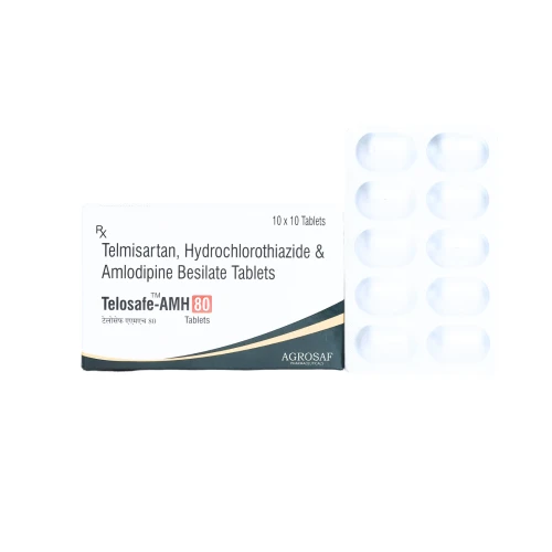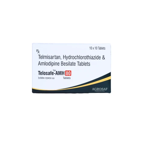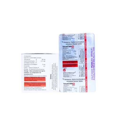 | Description: | TELOSAF-AMH 80 Tablet is a triple combination of Telmisartan 80mg (an angiotensin II receptor blocker – ARB), Amlodipine 5mg (a calcium channel blocker), and Hydrochlorothiazide 12.5mg (a thiazide diuretic), designed for the management of moderate to severe hypertension. This advanced formulation works through three complementary mechanisms—vasodilation, reduction of vascular resistance, and elimination of excess fluid—ensuring superior and sustained blood pressure control while reducing cardiovascular risk. |