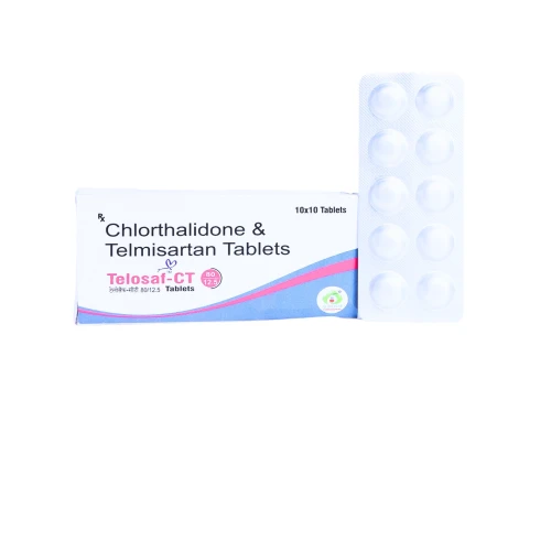 | Description: | TELOSAF-CT 80/12.5 Tablet is a combination of Telmisartan 80mg (an angiotensin II receptor blocker – ARB) and Chlorthalidone 12.5mg (a thiazide-like diuretic), indicated for the management of hypertension (high blood pressure). Telmisartan works by relaxing and widening blood vessels, while Chlorthalidone promotes the elimination of excess salt and water. This higher-strength combination is suitable for patients requiring more intensive blood pressure control and long-term cardiovascular risk reduction. |