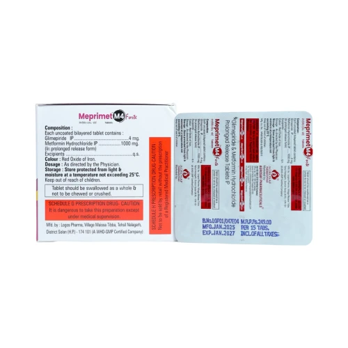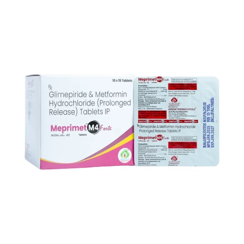 | How to Use: | Take MEPRIMET M4 FORTE Tablet orally, usually once daily with meals or as prescribed. Swallow the tablet whole with water. Do not skip meals to prevent hypoglycemia. Maintain a healthy diet and regular exercise routine. Monitor blood glucose levels regularly. |
