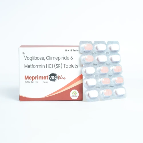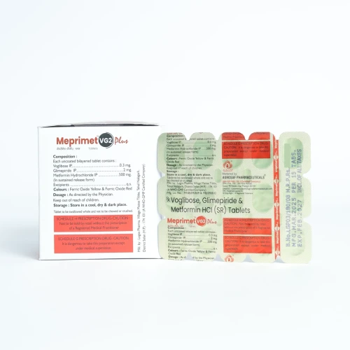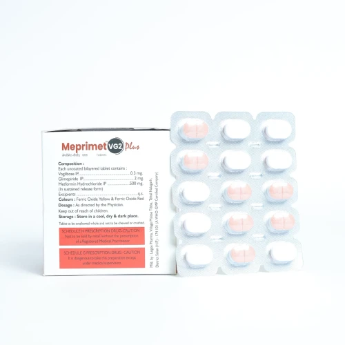 | How to Use: | Take MEPRIMET VG2 PLUS Tablet orally, usually once daily with meals or as prescribed. Take preferably just before or with the first bite of a meal. Swallow the tablet whole with water. Do not skip meals to prevent hypoglycemia. Monitor blood glucose levels regularly. |