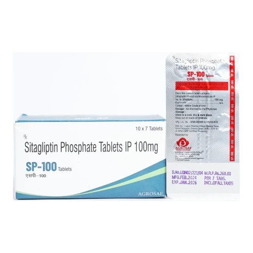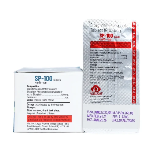 | Description: | S.P. 100 Tablet contains Sitagliptin 100 mg. It is used for the management of type 2 diabetes mellitus. Sitagliptin works by inhibiting the DPP-4 enzyme, increasing incretin hormone levels, which enhance insulin secretion and reduce glucagon levels, thereby improving blood glucose control. This higher strength is commonly prescribed for effective glycemic management. |