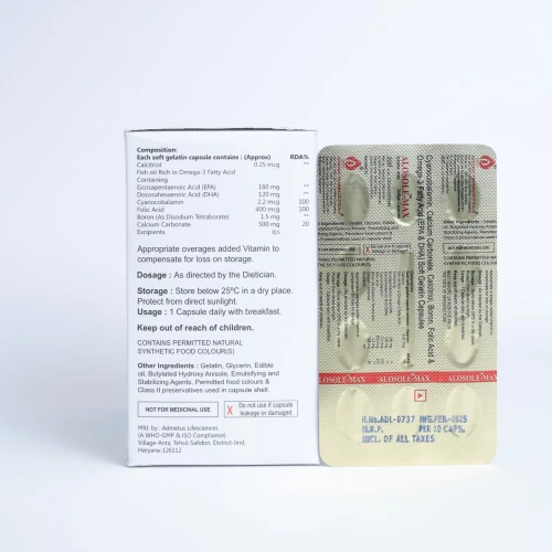 | COMPOSITION: | Boron 1.5 Mg+calcitriol 0.25 Mcg+calcium Carbonate 500 Mg+docosahexaenoic Acid 120 Mg+eicosapentaenoic Acid 180 Mg+folic Acid 400 Mcg+methylcobalamin 1500 Mcg |
