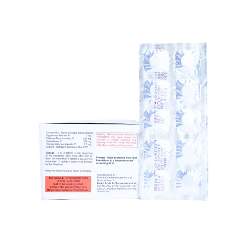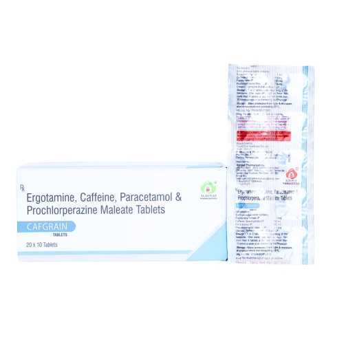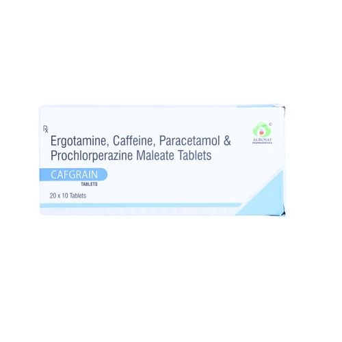 | Description: | CAFGRAIN Tablet is a combination medicine containing Ergotamine 1mg, Caffeine 100mg, Paracetamol 250mg, and Prochlorperazine 2.5mg. It is primarily used for the treatment of migraine attacks and severe headaches. Ergotamine works by narrowing blood vessels in the brain, relieving migraine pain. Caffeine enhances the pain-relieving effect of other components. Paracetamol provides analgesic and fever-reducing action. Prochlorperazine helps control nausea and vomiting associated with migraine. CAFGRAIN offers rapid relief from migraine symptoms, including pain, nausea, and light sensitivity, making it suitable for adults suffering from episodic migraine attacks. |