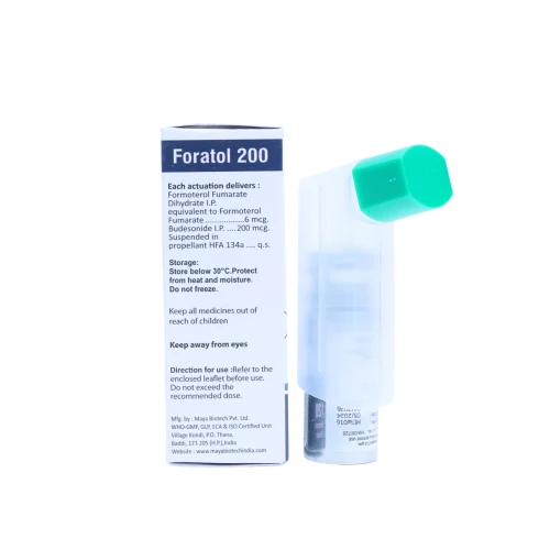 Description: FORATOL 200 Inhaler is a clinically formulated bronchodilator designed to provide quick and effective relief from asthma, bronchitis, and other respiratory conditions. Its metered-dose mechanism ensures precise delivery of medication directly to the lungs, helping to relax airway muscles, reduce inflammation, and improve breathing. Ideal for patients requiring fast-acting respiratory support under medical supervision.